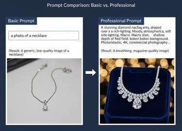 Professional prompts are detailed recipes that tell the AI exactly what to do. They include lighting, camera settings, composition, style, and mood. Without them, you're just gambling.